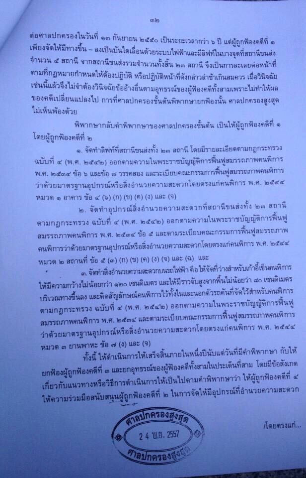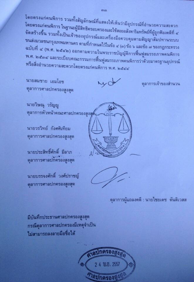 วันที่ 21 มกราคม 2558 เป็นวันประวัติศาสตร์สำหรับครือข่ายคนพิการ หลังมีการยื่นฟ้องและต่อสู้คดีรถไฟฟ้าบีทีเอสไม่มีลิฟต์-ทางเชื่อม เพื่อผู้พิการ ต่อศาลปกครอง นานถึง 20 ปี ซึ่งจะมีการอ่านคำพิพากษาศาลปกครองสูงสุดในบ่ายวันนี้ กรณีไม่จัดสิ่งอำนวยความสะดวกสำหรับคนพิการในรถไฟฟ้าบีทีเอส ซึ่งศาลปกครองกลางได้เคยมีคำสั่ง "ยกฟ้อง" แล้วครั้งหนึ่ง เมื่อ 22 กันยายน 2552 เนื่องจากกฏหมายไม่มีผลย้อนหลัง เพราะมีการทำสัญญาการก่อสร้างรถไฟฟ้าในปี 2539 ก่อนที่จะมีกฏกระทรวงมหาดไทยที่กำหนดว่าต้องมีสิ่งอำนวยความสะดวกโดยตรงแก่คนพิการและคนชรา ได้มีผลบังคับใช้ในปี 2542 ซึ่งเป็นเรื่องทางเทคนิค ไม่ใช่หลักการบริการสาธารณะวันนี้ที่หน้าศาลปกครองสูงสุด คนพิการ ผู้สูงอายุ และผู้สนใจ จะทะยอยมารวมตัว เพื่อมาฟังคำพิพากษาร่วมกัน เวลา 13.00 น. และมีการเปิดแถลงจุดยืนของเครือข่ายต่ออนาคตอิสรภาพและความเท่าเทียมในการเดินทาง เพราะการตัดสินของศาล ที่ถือว่าเป็นวันประวัติศาสตร์การต่อสู้ เรื่องนี้มาอย่างยาวนาน ตั้งแต่ก่อนปี 2538 นับถึงวันนี้ก็เป็นเวลากว่า 20 ปี ที่ประเทศไทยมีรถไฟฟ้า แต่คนพิการกลับไม่มีโอกาสได้เข้าถึงการใช้บริการ