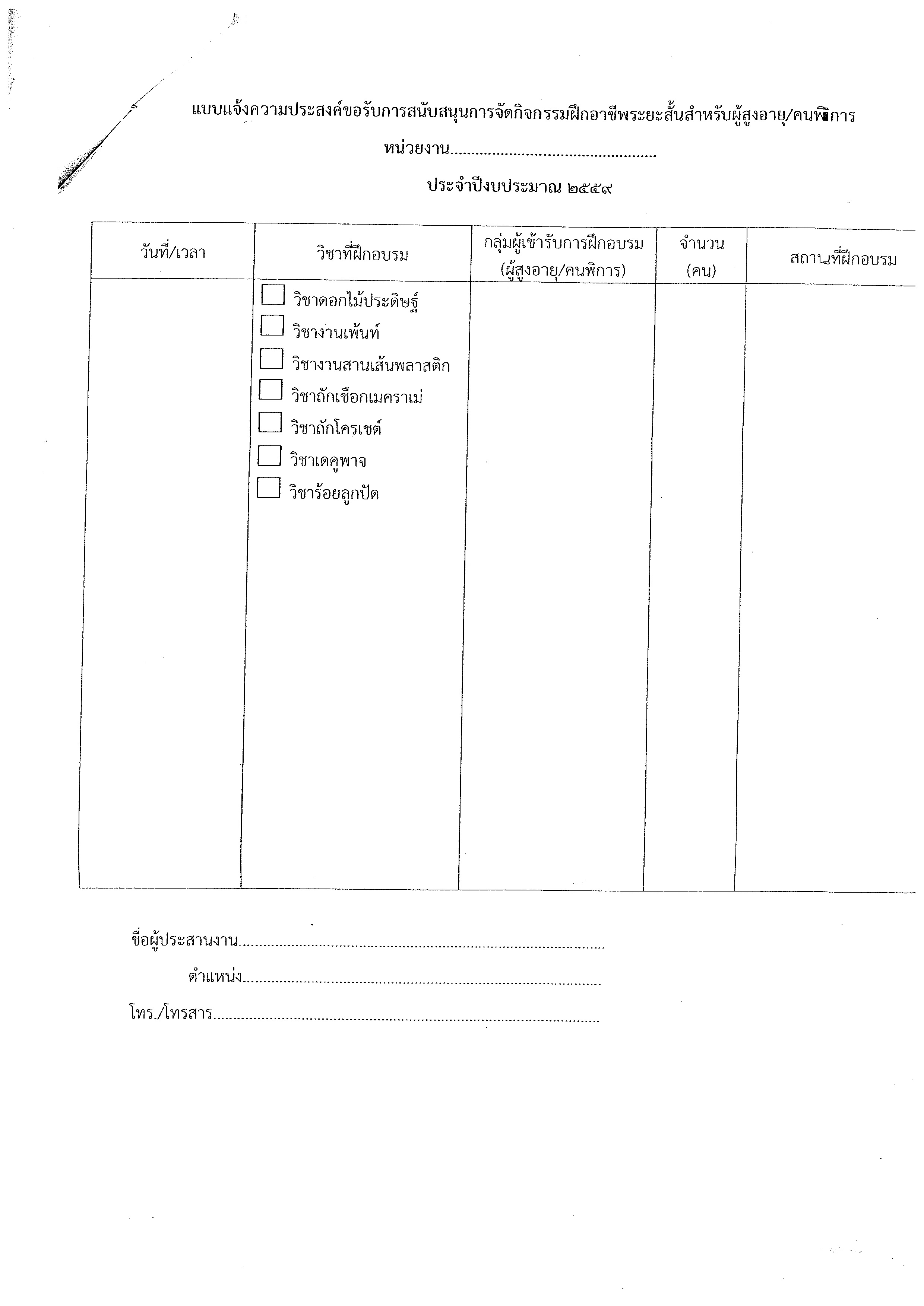 กองส่งเสริมอาชีพ พิจารณาแล้วเห็นว่า สำนักงานการสงเคราะห์และสวัสดิภาพสังคม มีภารกิจในการดูแลพัฒนาคุณภาพชีวิตผู้สูงอายุและคนพิการ จึงประชาสัมพันธ์มาเพื่อทราบและหากประสงค์จะจัดกิจกรรมฝึกอาชีพระยะสั้นดังกล่าว ขอได้โปรดจัดกลุ่มผู้สูงอายุและคนพิการ จำนวนกลุ่มละ 15 คนขี้นไป พร้อมแจ้งกำหนดวัน เวลา และสถานที่อบรม ตามแบบฟอร์มที่แนบ ให้กองส่งเสริมอาชีพทราบ เพื่อจักได้จัดเจ้าหน้าที่และวิทยากรไปให้บริการ ตามกำหนดต่อไป ทั้งนี้สามารถติดต่อสอบถามรายละเอียดเพิ่มเติมได้ที่ กลุ่มงานส่งเสริมอาชีพและพัฒนาผลิตภัณฑ์ กองส่งเสริมอาชีพ โทร 0 2247 9493 - 4 หรือโทร 3924-6