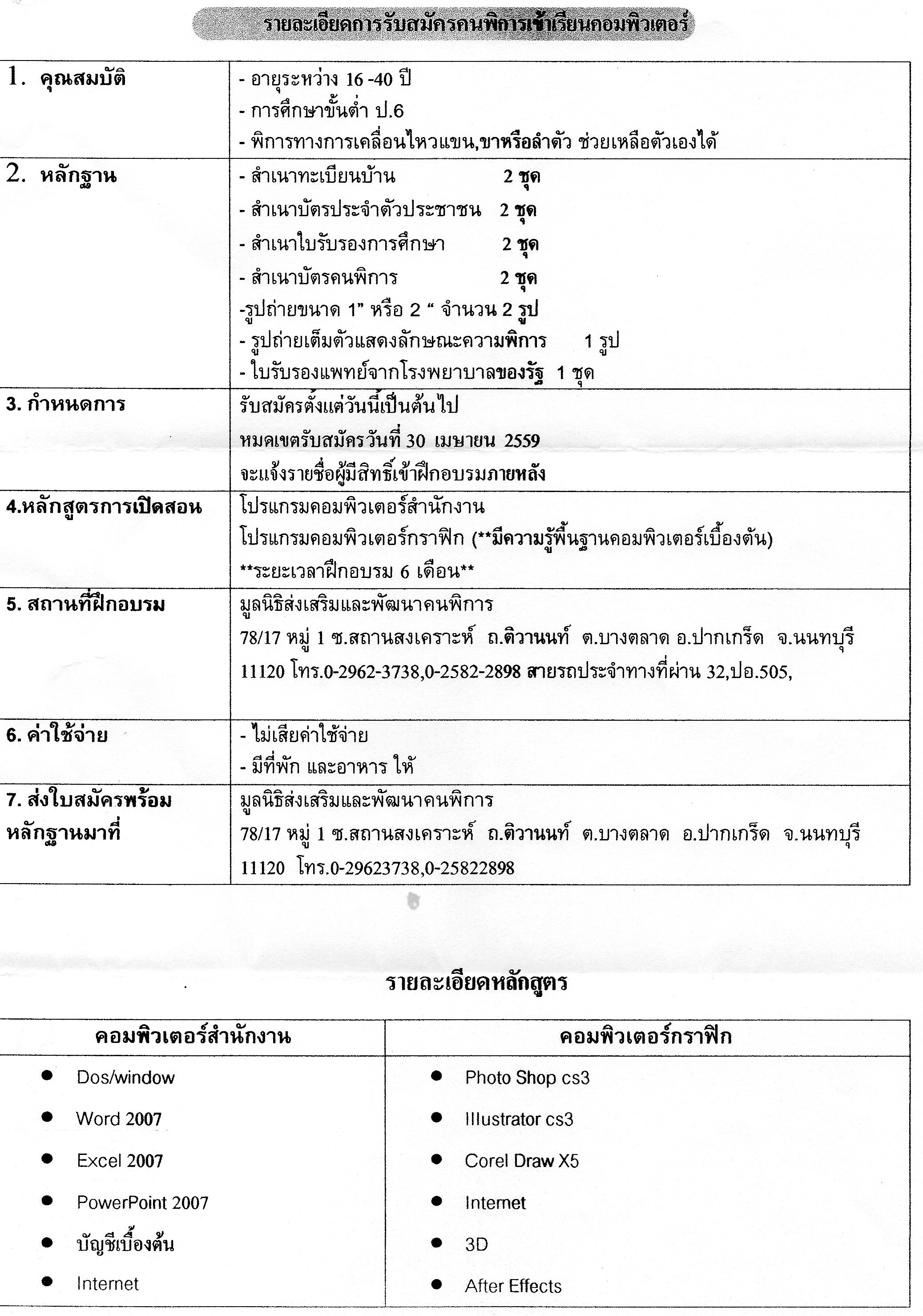 มูลนิธิส่งเสริมและพัฒนาคนพิการ ได้เปิดอบรมคอมพิวเตอร์ 2 หลักสูตร คือคอมพิวเตอร์สำนักงาน และคอมพิวเตอร์กราฟฟิก หลักสูตรละ 6 เดือน รวมเป็น 1 ปี แก่ผู้พิการ โดยผู้พิการไม่ต้องเสียค่าใช้จ่ายใดๆทั้งสิ้น กำหนดรับสมัครนักเรียนคอมพิวเตอร์สำนักงาน และคอมพิวเตอร์กราฟฟิก ตั้งแต่วันนี้ หมดเขตรับสมัคร วันที่ 30 เมษายน 2559 โดยจะแจ้งรายชื่อผู้มีสิทธิ์เข้ารับการฝีกอบรมให้ทราบภายหลัง