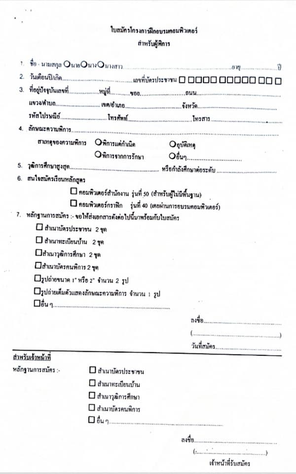 มูลนิธิส่งเสริมและพัฒนาคนพิการ รับสมัครคนพิการเข้าฝีกอบรมคอมพิวเตอร์