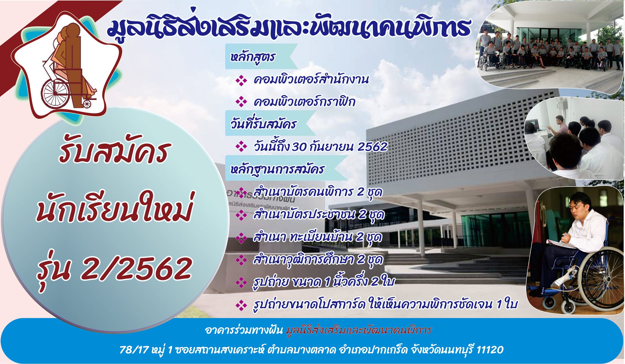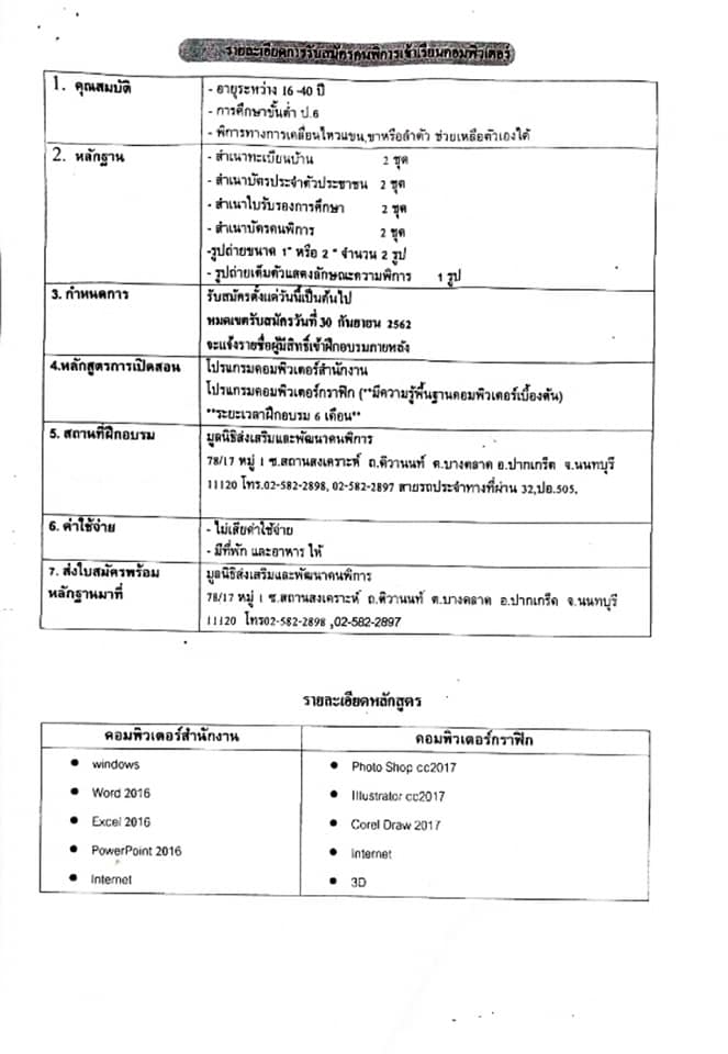 มูลนิธิส่งเสริมและพัฒนาคนพิการ ได้เปิดอบรมคอมพิวเตอร์ 2 หลักสูตร คือคอมพิวเตอร์สำนักงาน และคอมพิวเตอร์กราฟฟิก หลักสูตรละ 6 เดือน รวมเป็น 1 ปี แก่ผู้พิการ โดยผู้พิการไม่ต้องเสียค่าใช้จ่ายใดๆทั้งสิ้น กำหนดรับสมัครนักเรียนคอมพิวเตอร์สำนักงาน และคอมพิวเตอร์กราฟฟิก ตั้งแต่วันนี้ หมดเขตรับสมัคร วันที่ 30 กันยายน 2562 โดยจะแจ้งรายชื่อผู้มีสิทธิ์เข้ารับการฝีกอบรมให้ทราบภายหลัง ผู้สนใจสามารถติดต่อสอบถามข้อมูลเพิ่มเติมได้ที่ 02-582 2897
