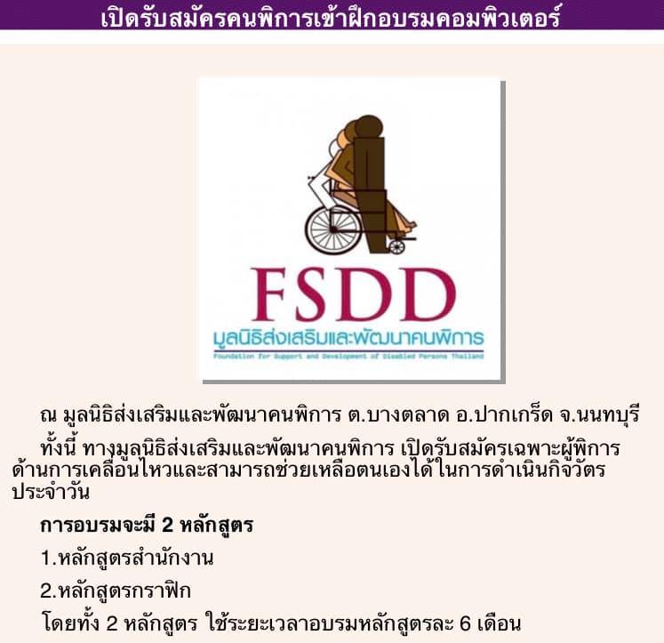 มูลนิธิส่งเสริมและพัฒนาคนพิการ ได้เปิดอบรมคอมพิวเตอร์ 2 หลักสูตร คือคอมพิวเตอร์สำนักงาน และคอมพิวเตอร์กราฟฟิก หลักสูตรละ 6 เดือน รวมเป็น 1 ปี แก่ผู้พิการ โดยผู้พิการไม่ต้องเสียค่าใช้จ่ายใดๆทั้งสิ้น กำหนดรับสมัครนักเรียนคอมพิวเตอร์สำนักงาน และคอมพิวเตอร์กราฟฟิก ตั้งแต่วันนี้ หมดเขตรับสมัคร วันที่ 31 ตุลาคม 2563 โดยจะแจ้งรายชื่อผู้มีสิทธิ์เข้ารับการฝีกอบรมให้ทราบภายหลัง ผู้สนใจสามารถติดต่อสอบถามข้อมูลเพิ่มเติมได้ที่ 02-582 2897-8